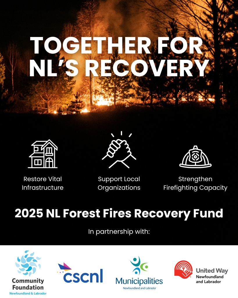 Facilitated by the Community Foundation of Newfoundland and Labrador, Community Sector Council of Newfoundland and Labrador, Municipalities Newfoundland and Labrador and United Way of Newfoundland and Labrador, the 2025 NL Forest Fires Recovery Fund is intended for long-term recovery efforts as identified by local communities when they are ready for rebuilding after emergency response. This provides funders and donors with the knowledge and comfort that their contributions will support projects that are prioritized by local communities with transparent and accountable local oversight.